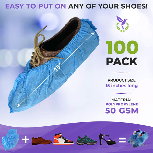 Blue Shoe Covers Disposable Non Slip, 15 Inches Long. Pack of 100 Polypropylene Disposable Shoe Covers for Indoors. 50 GSM Waterproof Disposable Booties for Shoes Covers for Men and Women