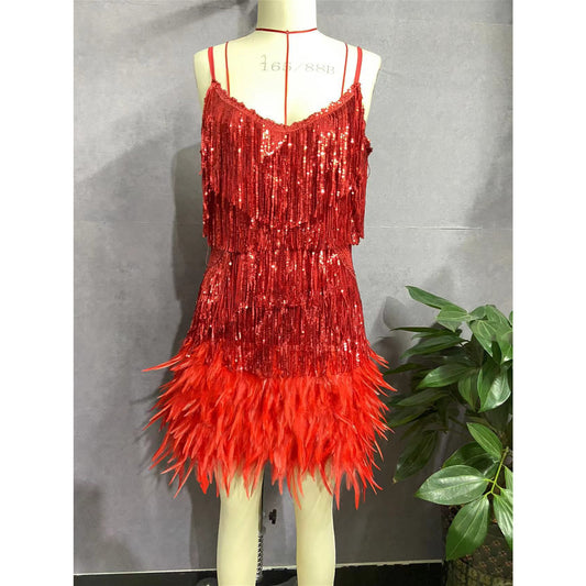 Summer Women Girl Mini Sling Evening Dress Fringed Dress Elegant Sexy Slim Fit Fashion Tassel Sequin Feather Stitching Short Skirt Back Zipper