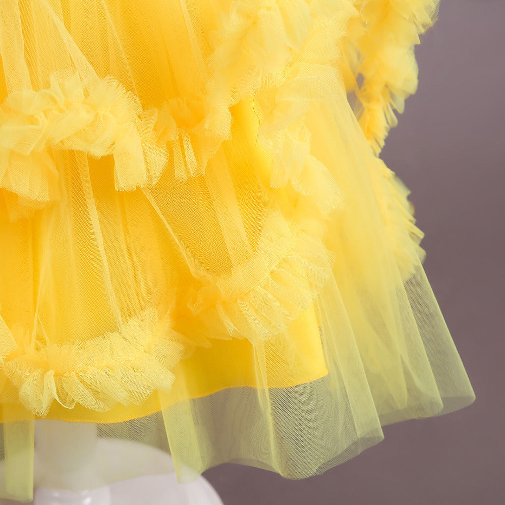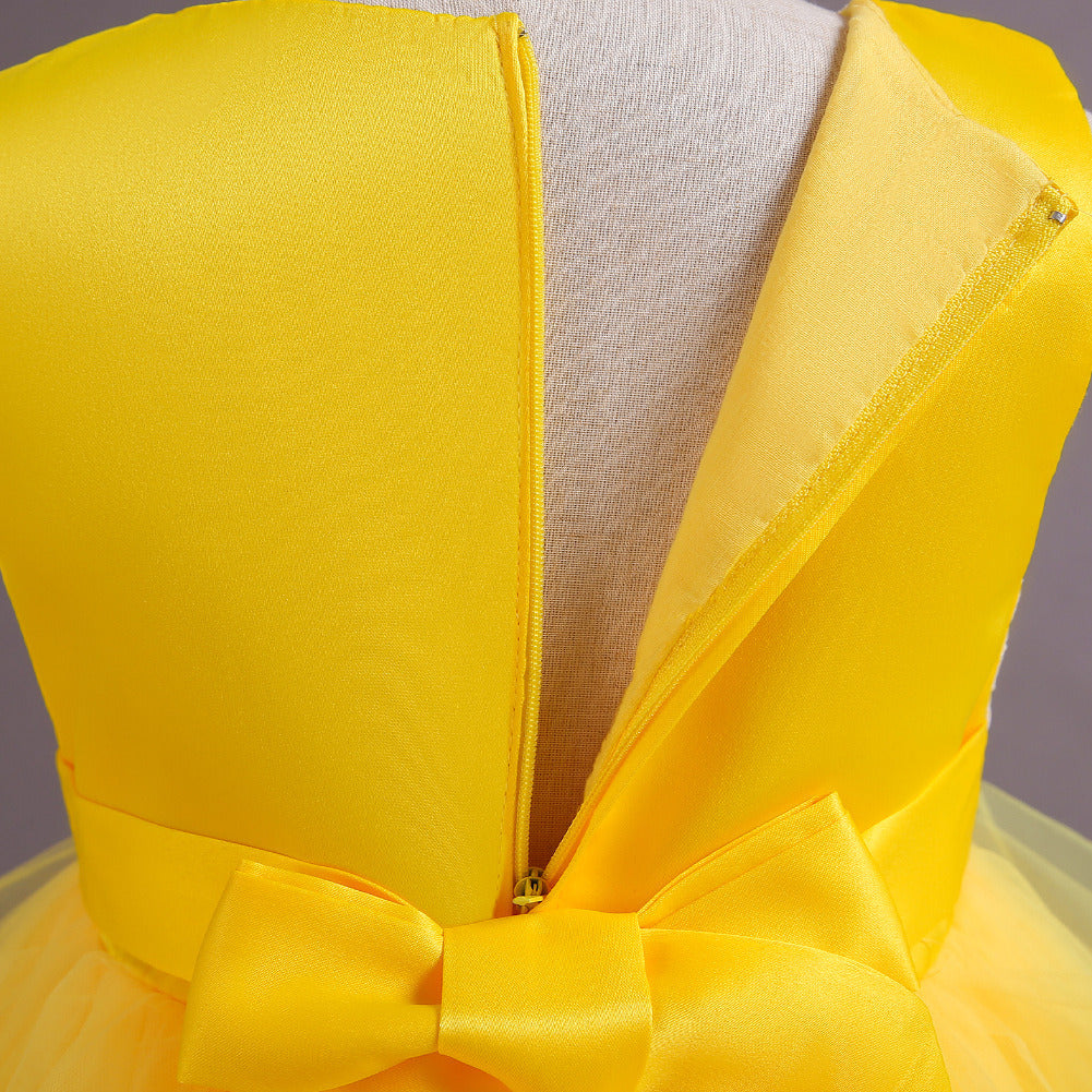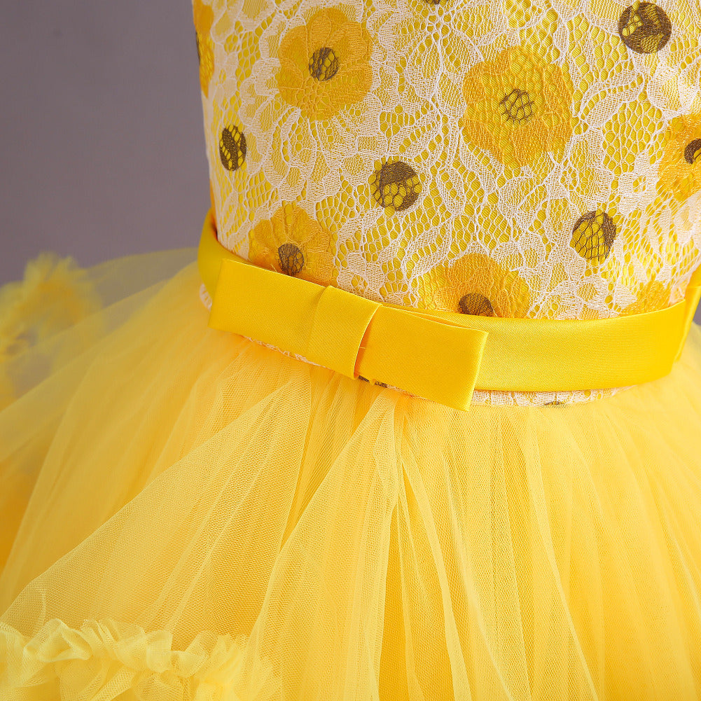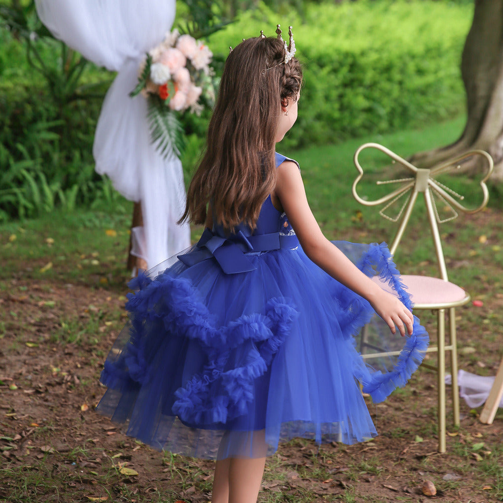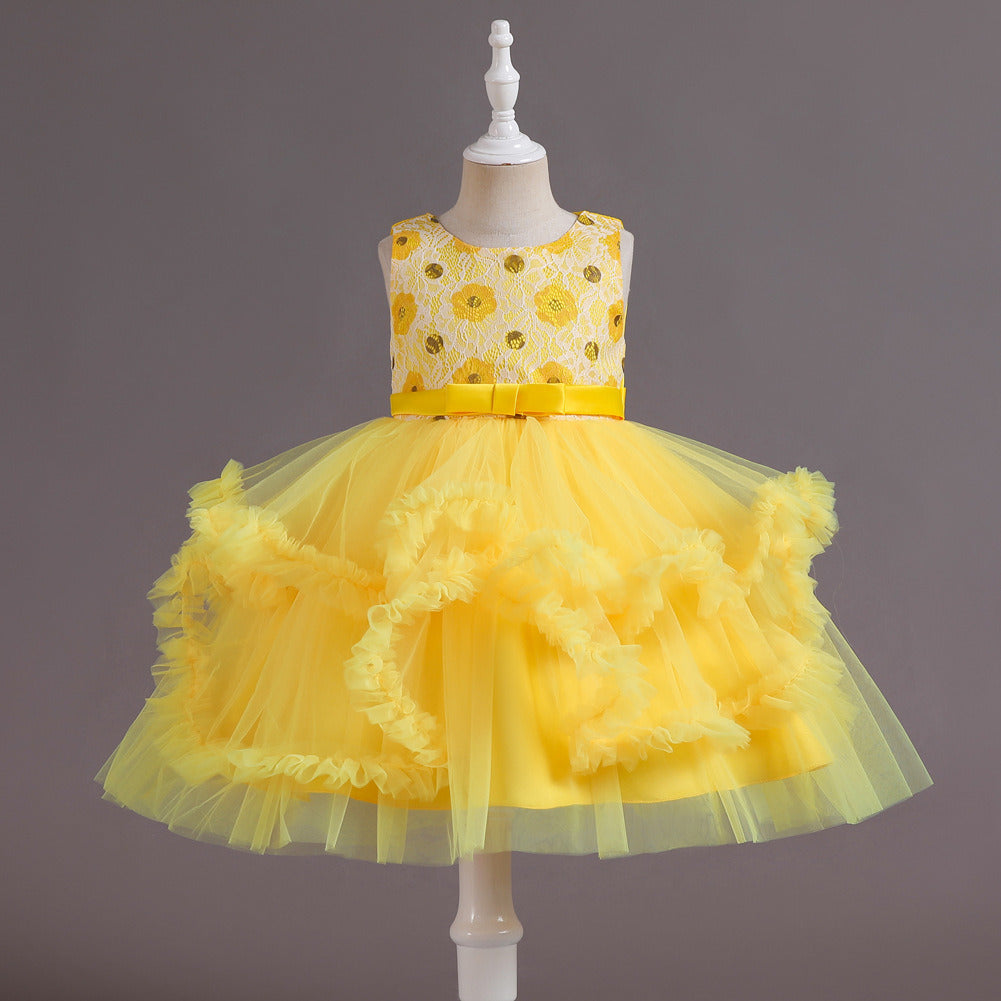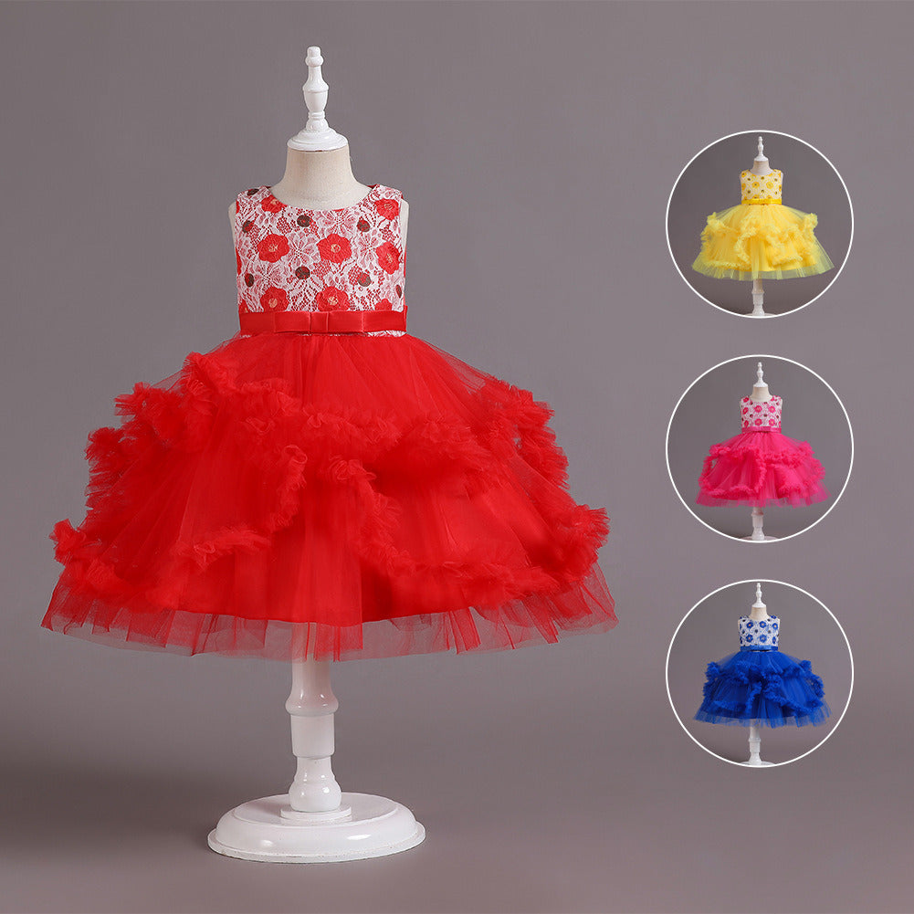 Layered fluffy dress with bow on the waistband and at the back. Sleeveless crew neck with lace flowers trim at bodice. Zip closure at back. The hem is layered tulle and a layer of lining.