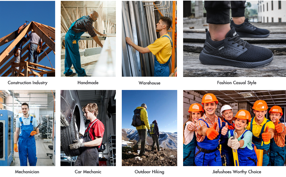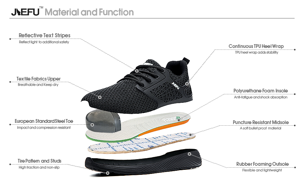 Jiefu work cushion work athletic achieves maximum lightness and flexibility in a work shoe. Rubber foam outsoles provide traction at heel strike and forefoot takeoff while minimizing weight. Textile uppers allow for ultimate breathability and moisture transfer for all-day cooling comfort. A memory tech massage footbed adapts to the unique contours of your foot. Fit for the way you work. Jiefu empowers people to be fit for life. Jiefu provides athletic performance technologies in every Jiefu safety shoe. Jiefu athletic safety shoes are lightweight; flexible; comfortable; and fit for demanding jobs.